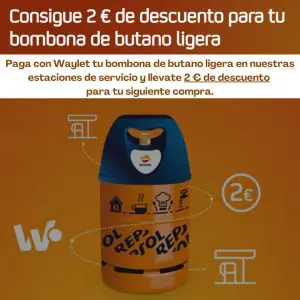 Válida del 15/11/2024 hasta el 30/04/2025, inclusive, en las estaciones de servicio Repsol adheridas a la promoción. Por la compra de una bombona de butano ligera (NEL) (12kg) realizando el pago a través de Waylet un descuento de 2€ para la siguiente compra del mismo envase; y de 1€ si la compra se realiza con otros medios de pago. Premios no acumulables ni compatibles a otras ofertas.